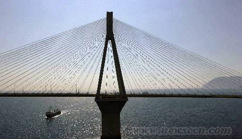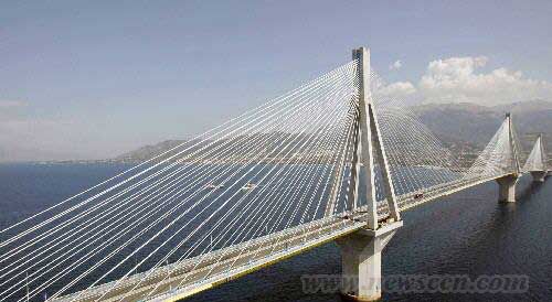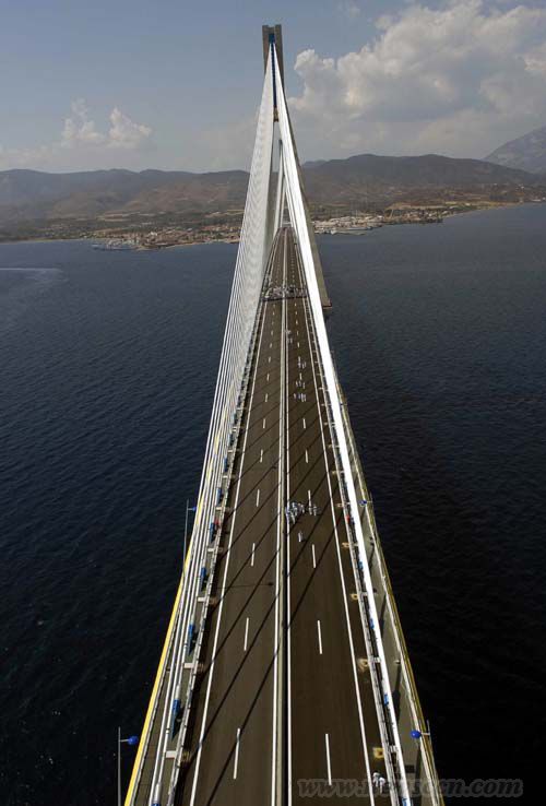 里永·安蒂里永大橋,該大橋全長(cháng)2883米,連接希臘大陸和伯羅奔尼薩半島。它不僅僅是世界上最長(cháng)的斜拉橋——橋面直接用懸索吊在龍門(mén)架上,而且還是世界上技術(shù)最先進(jìn)的橋梁之一。