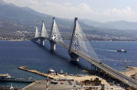 數千年的地殼運動(dòng)造成了希臘的伯羅奔尼薩半島和大陸的分離,而今年8月建成的、橫跨科林斯海灣里永-安蒂里永大橋將被自然界分離了幾千年的這兩塊陸地連接在了一起。它不僅僅是世界上最長(cháng)的斜拉橋—橋面直接用懸索吊在龍門(mén)架上,而且還是世界上技術(shù)最先進(jìn)的橋梁之一。