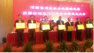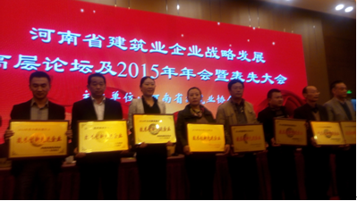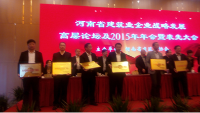 芳菲四月、春意盎然,在這萬(wàn)物吐翠的季節里。2015年4月13日,河南省建筑業(yè)協(xié)會(huì )在林州市召開(kāi)“河南省建筑業(yè)企業(yè)戰略發(fā)展高層論壇及2015年年會(huì )暨表先大會(huì )”,公司董事長(cháng)兼總經(jīng)理謝海如、總工程師王蘭蘭、副總謝飛、參加了本次會(huì )議。會(huì )上,中建協(xié)副會(huì )長(cháng)吳濤等各級領(lǐng)導做了重要講話(huà),聽(tīng)取了省協(xié)會(huì )秘書(shū)長(cháng)李娟的工作報告并通過(guò)各項議程。給建筑業(yè)企業(yè)指明了方向、提供了有力的支撐。同時(shí),會(huì )議對2014年度獲得先進(jìn)企業(yè)的單位和個(gè)人進(jìn)行了通報表彰。就建筑業(yè)共謀發(fā)展道路,不斷創(chuàng  )新,持續改進(jìn)等進(jìn)行了經(jīng)驗交流。此次會(huì )議上,總經(jīng)理謝海如同志、總工王蘭蘭同志副總謝飛同志分別上臺領(lǐng)取了 “河南省建筑業(yè)前二十強企業(yè)”、“河南省建筑業(yè)先進(jìn)企業(yè)”、“建筑安全先進(jìn)企業(yè)”、“建設工程質(zhì)量管理先進(jìn)企業(yè)”“河南省建筑業(yè)技術(shù)創(chuàng  )新先進(jìn)企業(yè)”等多項榮譽(yù)獎牌。