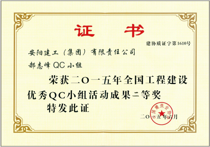201562225日,中國建筑業(yè)協(xié)會(huì )工程建設質(zhì)量管理分會(huì )在云南昆明召開(kāi)了“2015年全國工程建設優(yōu)秀QC小組活動(dòng)成果交流會(huì )”,對2015年優(yōu)秀QC小組活動(dòng)成果進(jìn)行了交流、表彰。我公司郝志峰QC小組活動(dòng)成果參加此次交流會(huì ),并榮獲“2014年全國工程建設優(yōu)秀QC小組活動(dòng)成果二等獎”的榮譽(yù)稱(chēng)號。
