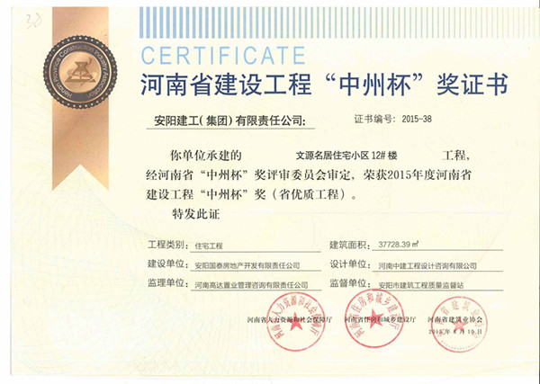 我單位承建的“文源名居住宅小區12#樓”榮獲2015年度河南省建設工程“中州杯”獎