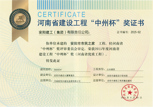 我單位承建的“安陽(yáng)市市民之家”工程榮獲2015年度河南省建設工程“中州杯“獎”