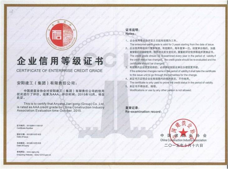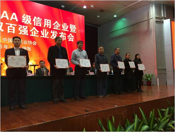 2016年1月7日,中國建筑業(yè)協(xié)會(huì )在珠海隆重召開(kāi)全國建筑業(yè)AAA級信用企業(yè)暨中國建筑業(yè)雙百強企業(yè)發(fā)布會(huì ),向我公司在內的共277家2015年度全國建筑業(yè)AAA級信用企業(yè)和榮獲2014年度雙百強的企業(yè)頒發(fā)獎牌和證書(shū),我公司很榮幸的作為企業(yè)代表上臺領(lǐng)取了AAA級信用企業(yè)證書(shū)。