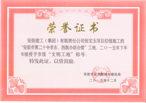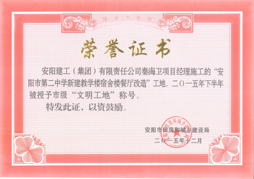 在2016年開(kāi)工的第一周,從安陽(yáng)市住房和城鄉建設局獲悉,我公司承建的“安陽(yáng)市第二十中學(xué)教辦樓”、“安陽(yáng)市第二中學(xué)新建教學(xué)樓宿舍樓餐廳改造”榮獲2015年度下半年市級安全文明標準化工地稱(chēng)號。此次評選,市住建局協(xié)同相關(guān)部門(mén)嚴格按照《河南省安全文明工地評審辦法》和《安陽(yáng)市安全文明工地評審辦法》,旨在鼓勵先進(jìn)、鞭策后進(jìn)、共同進(jìn)步,對各施工企業(yè)申報的安全文明工地進(jìn)行的一次檢查和評比。