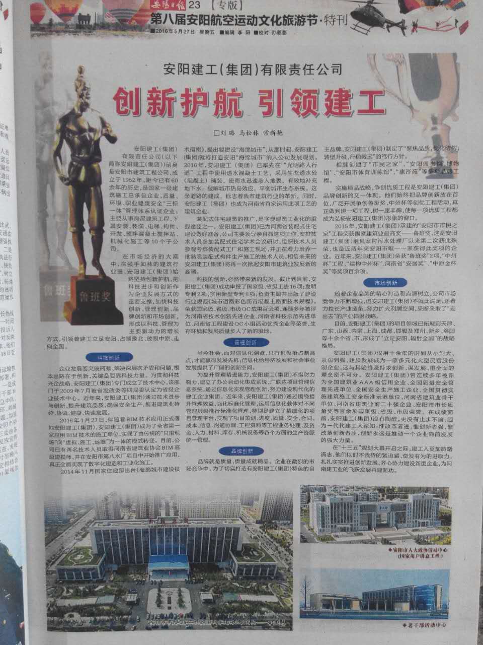 前不久,經(jīng)市住建局推薦,集團辦公室馬松林、常新艷、劉璐寫(xiě)稿的《創(chuàng )新護航  引領(lǐng)建工》榮登2016年5月27日安陽(yáng)日報“第八屆安陽(yáng)航空運動(dòng)文化旅游節-特刊”專(zhuān)版。