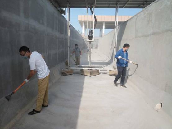 然而,要說(shuō)環(huán)境艱苦,還有工程部、經(jīng)營(yíng)部、成本控制中心及信息部負責的疊合池區域。同志們需要踏著(zhù)十幾米的竹梯下到疊合池底部,頭頂烈日,幾個(gè)人分一組,負責偌大的一個(gè)池子的衛生清掃工作。同時(shí),由于出入不方便,同志們還要忍受著(zhù)干渴來(lái)工作,但是大家沒(méi)有怨言,仔仔細細的清掃。俗話(huà)說(shuō)上山容易下山難,對于疊合池清理工作來(lái)講,打掃容易、運輸難,他們需要把清掃好的垃圾裝進(jìn)編織袋,然后由站在疊合池上方的兩名同志從十幾米高的站臺上使勁往上拉方可運走,幾十袋沉重的垃圾就這么用最原始的方法被運出。