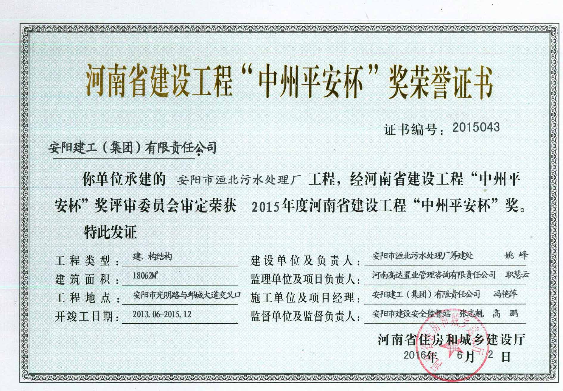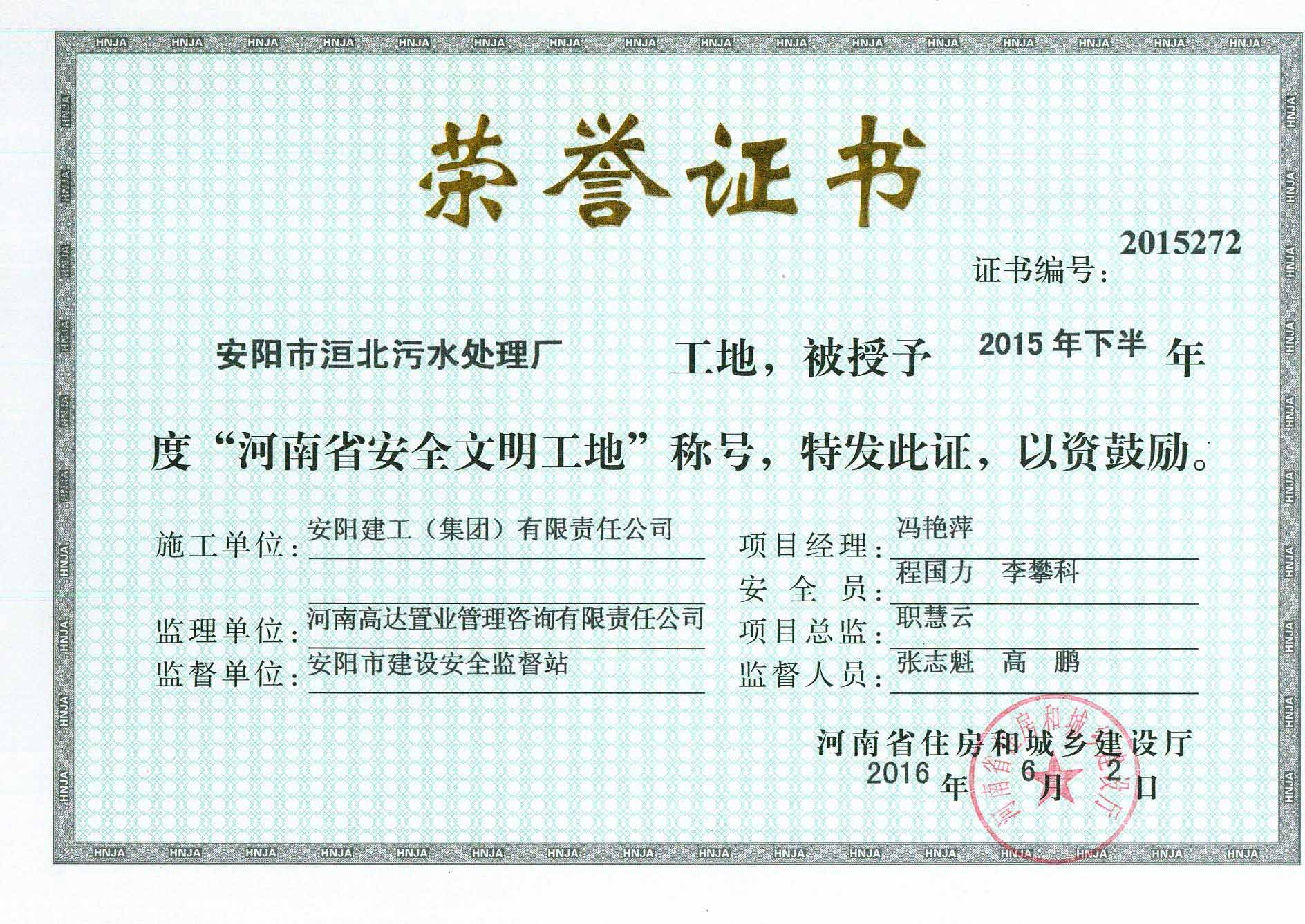 根據河南省安全文明工地評審辦法河南省建設工程“中州平安杯”獎評審管理辦法,河南省住房和城鄉建設廳組織人員對申報2015年度河南省建設工程“中州平安杯”獎和申報“河南省安全文明工地”的工程項目進(jìn)行了評審,經(jīng)過(guò)評審由我公司承建的“安陽(yáng)市洹北污水處理廠(chǎng)”工程已通過(guò)評審委員會(huì )評審,被評為2015年度河南省建設工程“中州平安杯”獎和“河南省安全文明工地”。