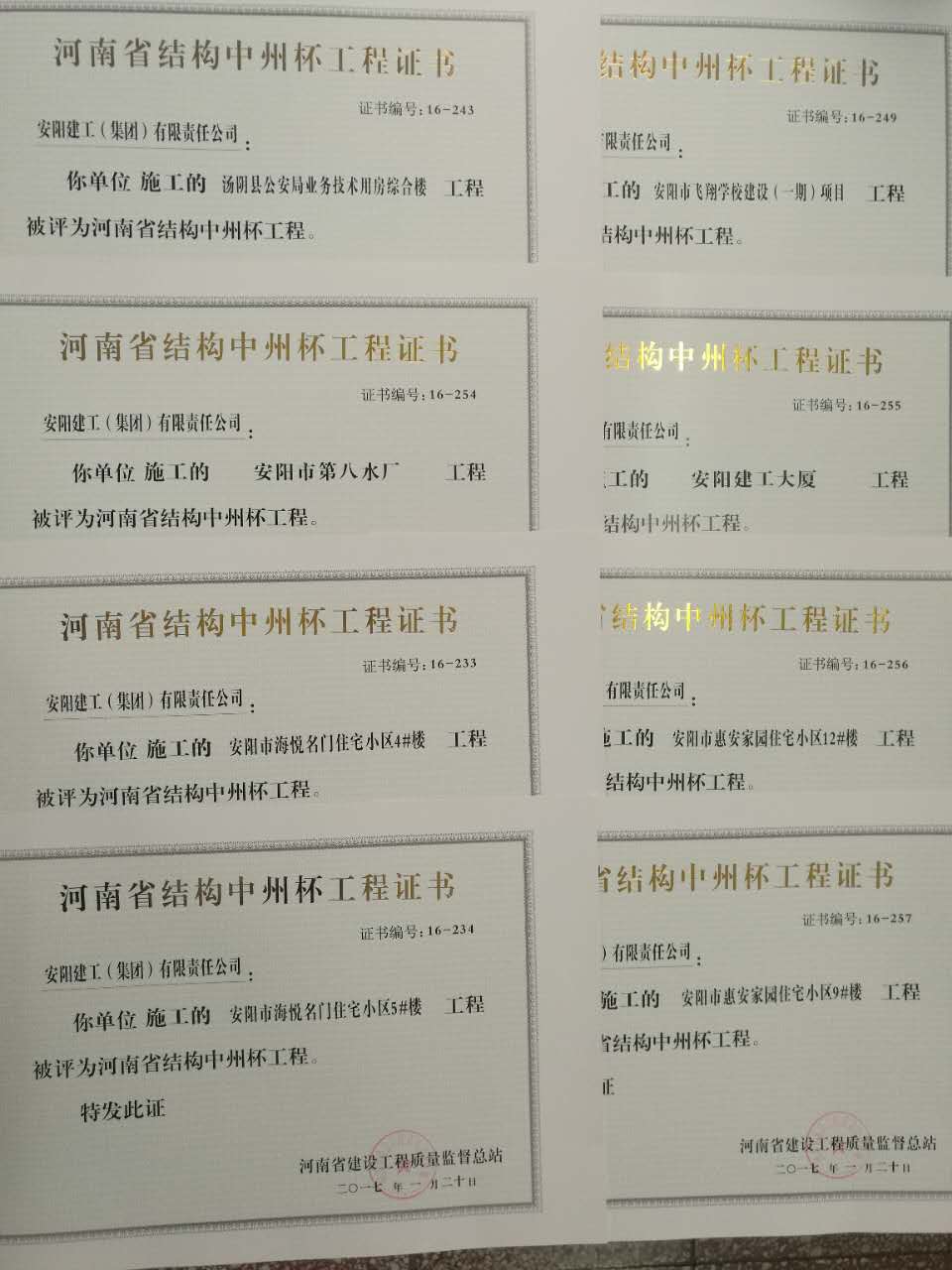 由我公司承建的“安陽(yáng)市第八水廠(chǎng)”等八項工程經(jīng)過(guò)企業(yè)申報,省轄市、省直管縣(市)及專(zhuān)業(yè)質(zhì)監站推薦,河南省“結構中州杯”評審委員會(huì )評審,被評為2016年度河南省“結構中州杯”獎。近來(lái),公司不斷加大工程質(zhì)量安全監管力度,使工程整體處于受控狀態(tài),并且堅持進(jìn)行紅旗工地評比,對較好的工地頒發(fā)紅旗,使各項目部進(jìn)一步增強質(zhì)量責任意識,不斷強化質(zhì)量管理工作,創(chuàng )建更多的優(yōu)質(zhì)精品工程。                 (工程部  玄麗)
