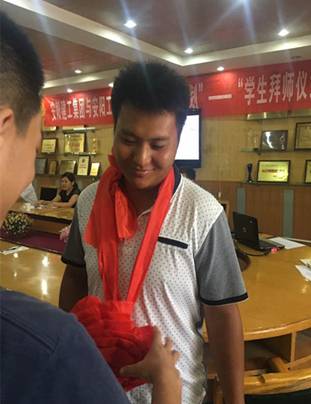 拜師儀式上,學(xué)生向自己的師傅鞠躬、敬茶,獻花,行拜師禮。指導老師代表原國瑞發(fā)言表態(tài),“一定恪盡職守,全力教導,起到帶頭示范作用”,學(xué)生代表在隨后的發(fā)言中表示,“一定虛心請教,把師傅作為學(xué)習的楷?!?。