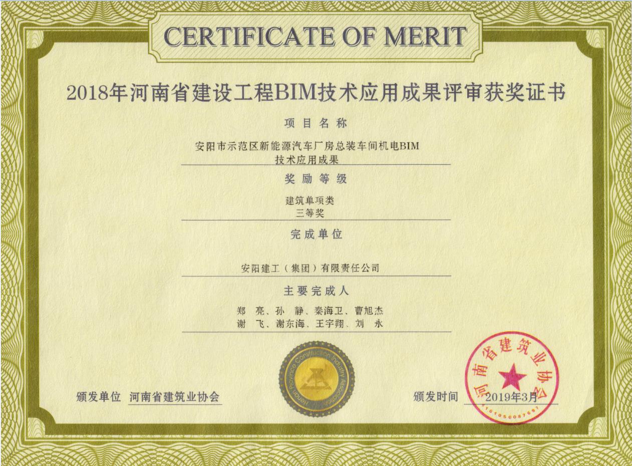 2018年河南省建設工程BIM技術(shù)應用成果評審獲獎證書(shū)。