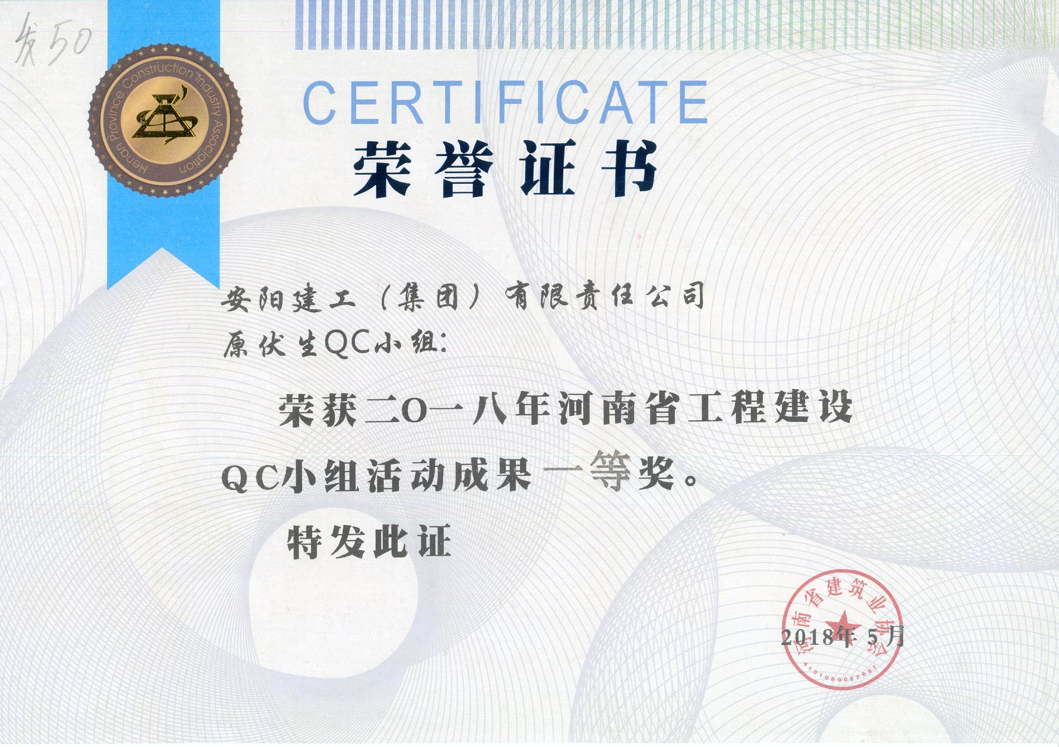我公司原伏生QC小組榮獲2018年河南省工程建設QC小組活動(dòng)成果一等獎