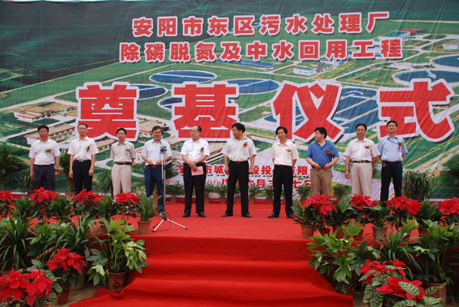 6月27日,集團公司承建的安陽(yáng)市東區污水處理廠(chǎng)除磷脫氮及中水回用工程舉行開(kāi)工奠基儀式,這是我市繼晃家村污水處理廠(chǎng)工程竣工后,為進(jìn)一步落實(shí)科學(xué)發(fā)展觀(guān)、改善城區人居環(huán)境、構建和諧社會(huì )而實(shí)施的又一生態(tài)工程和民心工程。安陽(yáng)市副市長(cháng)倪豫洲等領(lǐng)導出席了奠基儀式,安陽(yáng)市城市建設投資有限公司、首創(chuàng  )水廠(chǎng)、安陽(yáng)建工集團及監理單位的領(lǐng)導、員工參加了儀式。