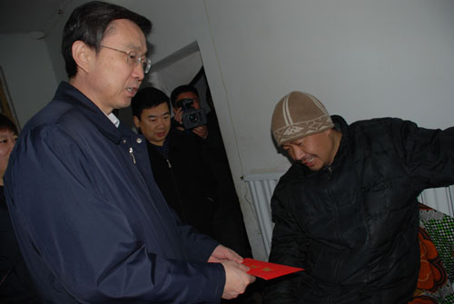 市領(lǐng)導與梁躍河家人親切交談、噓寒問(wèn)暖,詳細詢(xún)問(wèn)了梁躍河的家庭生活情況。當得知作為家庭頂梁柱的梁躍河因腦出血多年偏癱,生活不能自理,愛(ài)人下崗,兒子在上高中,老母親也患有心臟病,生活十分困難時(shí),李書(shū)記鼓勵他們要樹(shù)立生活的信心,勇敢面對眼前的困難,相信在黨和政府的幫助下,生活困難會(huì )逐漸得到解決,日子也會(huì )一天天地好起來(lái),并囑咐在場(chǎng)的隨行人員,要采取措施,盡力幫助他們,讓他們過(guò)一個(gè)歡樂(lè )、祥和的春節。當接過(guò)飽含全市人民關(guān)懷與溫暖的慰問(wèn)金時(shí),因病不能說(shuō)話(huà)的梁躍河流下了感動(dòng)的淚水,其老母親激動(dòng)的說(shuō):感謝黨和政府,感謝市領(lǐng)導、工會(huì )領(lǐng)導冒著(zhù)嚴寒來(lái)看我們!