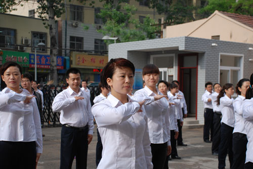 每天清晨,迎著(zhù)噴薄而出的朝陽(yáng),員工統一著(zhù)裝,整齊列隊,在音樂(lè )的伴奏下集體做大眾廣播體操。員工們一絲不茍的神態(tài),筆挺高雅的工裝,整齊劃一的動(dòng)作,吸引了路人的駐足觀(guān)看,成為一道靚麗的風(fēng)景線(xiàn)。